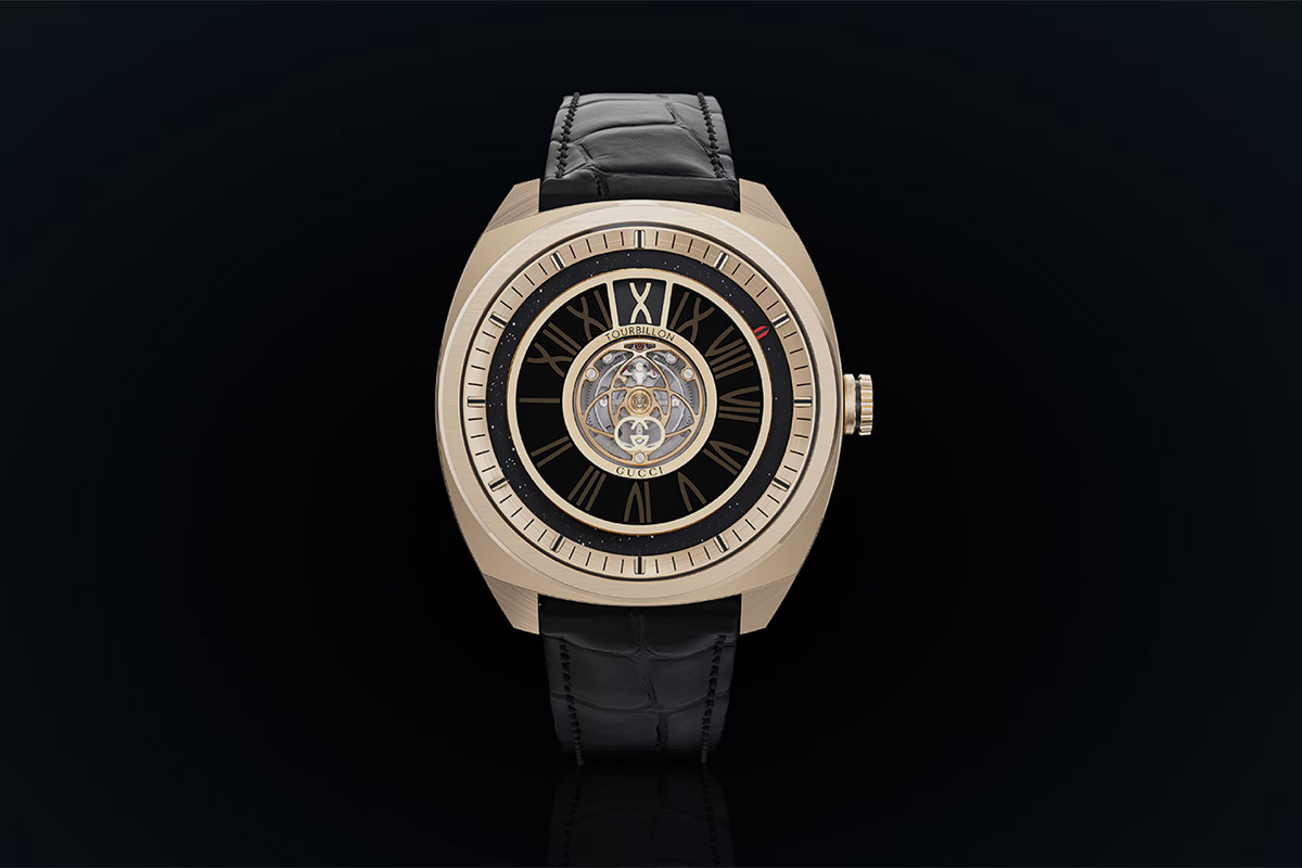 Sviluppato all’interno del Gucci Watch Lab di Cortaillod, invece, il tourbillon centrale della Maison adotta due look differenti che seguono l’estetica di altrettante collezioni. Più sobrio ed essenziale, il Gucci Interlocking presentato quest’anno mette il tourbillon al centro di un anello di avventurina, che riporta l’indice dei minuti, mentre le ore saltanti sono mostrate con numeri romani in una finestrella a ore 12. Declinato in tre modelli, in oro bianco o rosa con quadrante in avventurina nera o blu, si distingue per la gabbia del tourbillon personalizzata dal logo.