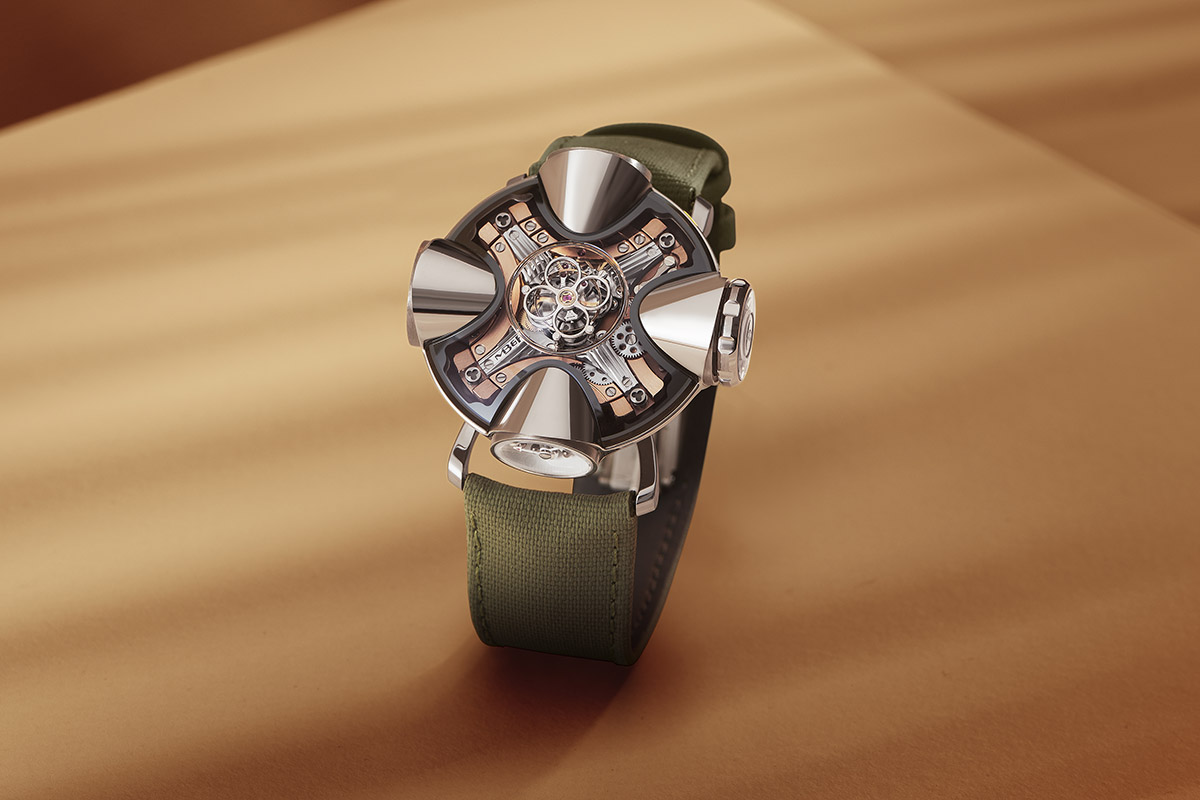 Estremamente insolito è poi l’HM11 Architect di MB&F, con tourbillon centrale orizzontale ma una costruzione “organica”, che rimanda a certe abitazioni sperimentali degli anni ’60/’70. La cassa è infatti costituita da quattro volumi simmetrici dalla forma parabolica, quattro stanze che mostrano rispettivamente le ore e i minuti, l’autonomia residua, la temperatura esterna e il logo a forma di ascia bipenne. Al centro, protetto da una cupola di vetro zaffiro, si staglia il tourbillon volante invertito con un ponte a forma di fiore quadrilobato. Lanciato lo scorso anno, l’HM11 monta un esclusivo movimento tridimensionale, con ingranaggi conici, che ha richiesto anni di sviluppo – i primi progetti, firmati dal designer Eric Giroud, sono datati 2018. In titanio con quadrante azzurro oppure oro rosso, l’orologio è realizzato in due serie limitate di 25 esemplari ciascuna.