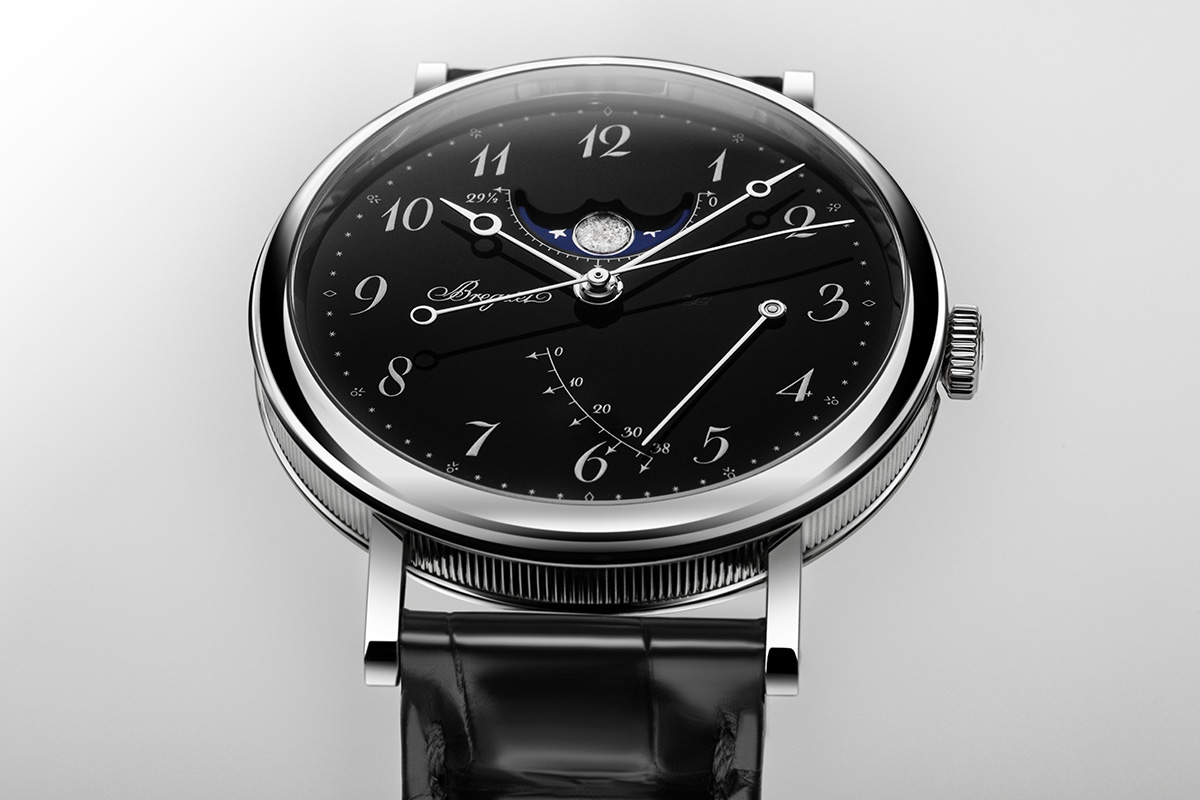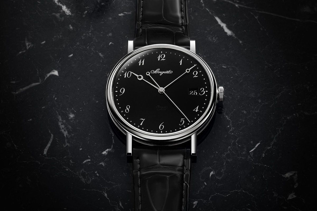 Più nel dettaglio, si tratta di un orologio sottile (se non proprio extra-piatto), elegantissimo. Da sera, anzi da gran sera, sarebbe perfetto anche con uno smoking e perfino con un tight. La cassa misura 38 mm di diametro ed è sottile solo 8,8 mm. Il total look nero ben interpreta lo stile essenziale – verrebbe da dire neoclassico – e la purezza delle linee derivata direttamente dagli esemplari da tasca di Abraham-Louis Breguet. Se mi guardo indietro nel tempo, ne ricordo almeno due precedenti, sempre con il quadrante in smalto Grand Feu: bianco, uscito nel 2012, e blu, nel 2019. Senza contare quelli degli anni 2012/13 con il quadrante guilloché – che sembrano provenire da un’altra famiglia, tanto sono diversi.