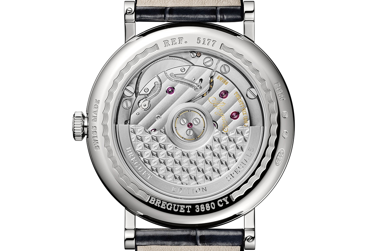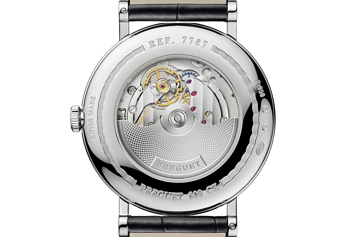 Dal punto di vista meccanico, è animato dal calibro 777Q. A carica automatica, fornito di funzioni semplici come i secondi al centro e il datario a ore 3, coniuga tecnologia e tradizione. È dotato infatti di 55 ore di autonomia e di componenti in silicio (spirale piatta, àncora e ruota di scappamento), che ne aumentano l’affidabilità cronometrica. Ma vanta anche elementi estetici d’antan: come il profilo di alcune ruote, ripreso da certi Breguet della fine del XVIII secolo, o la massa oscillante in oro guilloché, con un motivo definito dalla Maison “a mosaico stellato”. Voglio ricordare infatti che la rabescatura effettuata rigorosamente a mano con gli antichi torni, è una specialità della Manifattura Breguet.