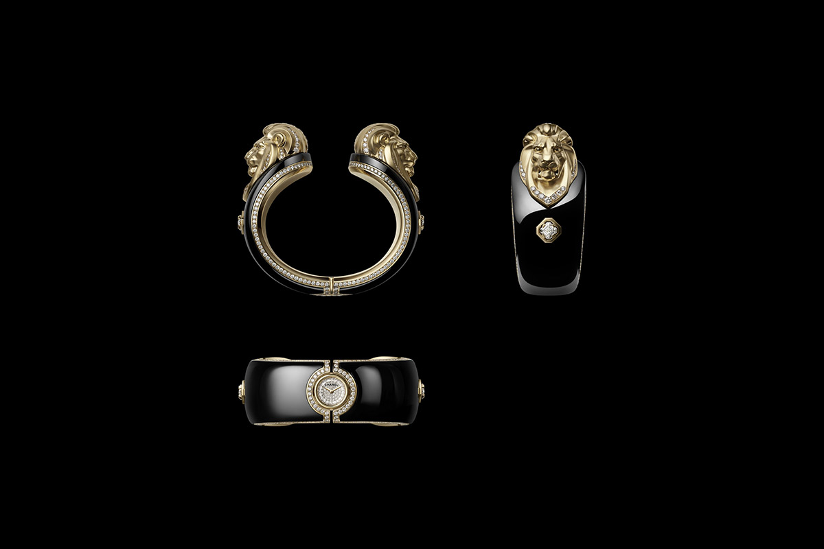 Per passare al bracciale a manchette Lion Secret. Il riferimento è di nuovo nell’appartamento parigino: la scultura di un possente leone con la zampa appoggiata su una sfera, simbolo di potere e protezione, presente in vari angoli del salone/biblioteca, riprodotta in marmo o in bronzo dorato. Lo Studio di M.Chastaingt ne aveva già tratto ispirazione per il Lion Astroclock. Qui è invece tramutata in un bassorilevo in oro, stagliato su uno sfondo d’onice, la palla sostituita da un brillante. All’interno racchiude l’orologio con la lunetta incastonata di brillanti e il quadrante laccato dall’effetto matelassé. La forma ottagonale del bracciale ricorda invece il tappo del flacone del N° 5. I problemi realizzativi posti da questo esemplare sono stati principalmente due. Uno, il peso del bracciale oversize, risolto rivestendo l’interno di titanio annerito. E poi la finitura delle ampie superfici di metallo, che hanno richiesto 35 ore di lavoro.