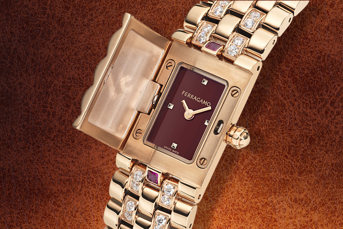 Seppure arricchito dalle gemme, alla prima occhiata il protagonista resta il bracciale a cinque maglie, su cui è inciso il logo Ferragamo in verticale. Però, basta una leggera pressione sulla cassa per far apparire a sorpresa il mini-quadrante, che poi scompare dietro lo sportellino, con la lieve spinta di un dito.