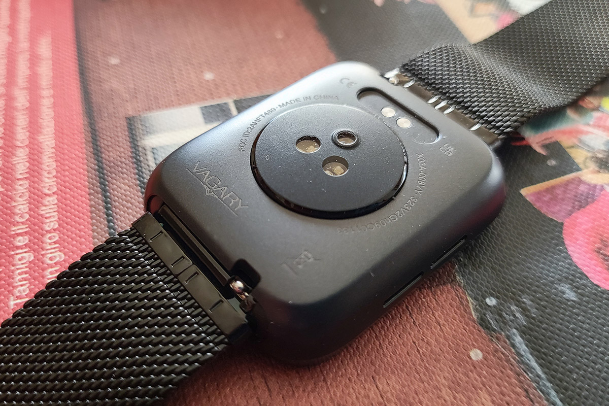 La cassa è realizzata in Abs, dalle finiture convincenti che simulano bene l’effetto dell’acciaio. Le dimensioni generose (37,7 x 45,5 mm, per 42 g di peso) lo rendono più presente al polso rispetto al modello precedente, una scelta che privilegia la leggibilità ma che potrebbe non convincere chi ha un polso sottile. Per questo esiste anche in un formato più piccolo, unisex (versione X02). Disponibile in tre varianti di colore – metallo naturale, grigio antracite, color oro rosa -, offre versatilità per interpretare stili diversi. Il bracciale in maglia milanese aggiunge un tocco di ricercatezza, rendendolo adatto sia a contesti formali che casual. Nel mio caso, l’ho trovato equilibrato e confortevole quando indossato correttamente, ovvero almeno un dito sopra l’osso del polso per garantire il corretto funzionamento dei sensori.