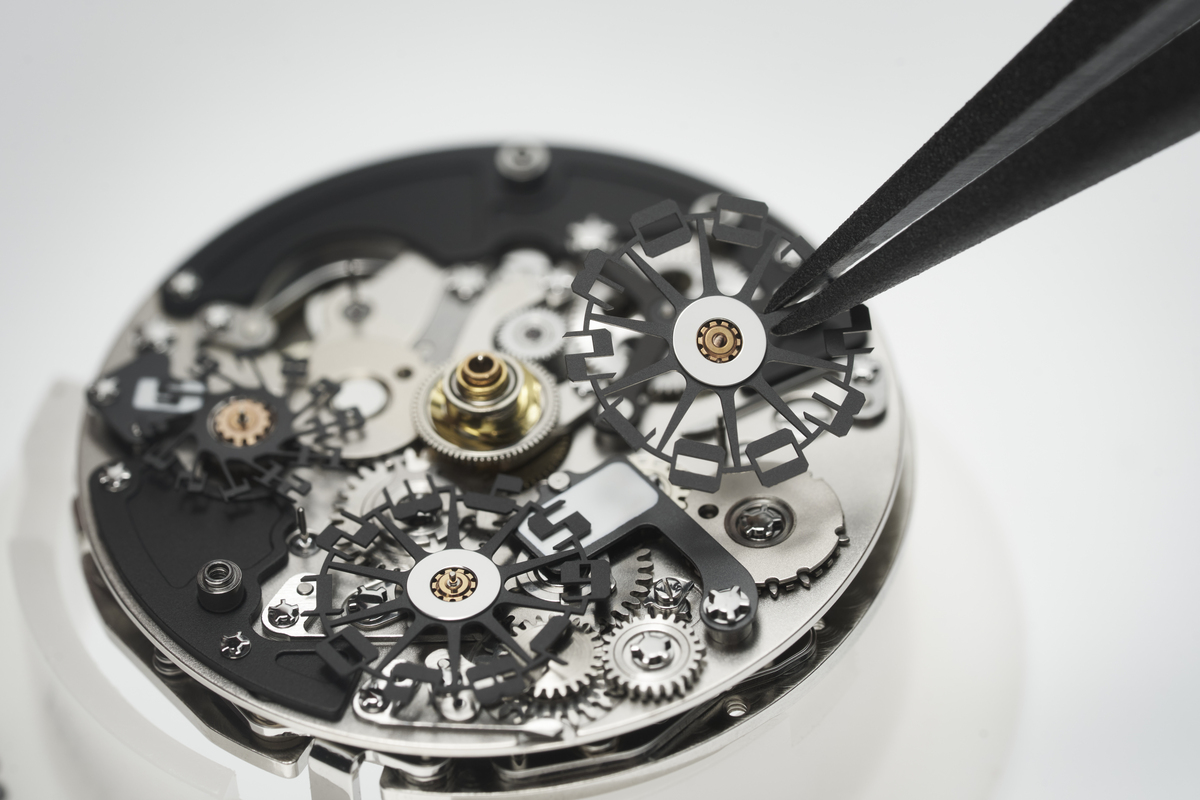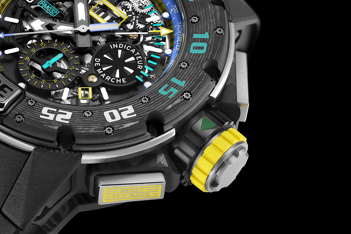 Al perfetto funzionamento del movimento nel cuore dell’RM 032 Automatic Flyback Chronograph Ultimate Edition contribuiscono anche altri importanti accorgimenti tecnici. Per esempio, ponti e platina in titanio grado 5, una lega composta da un 90% di titanio, un 6% di alluminio e un 4% da vanadio. Si tratta di un bilanciamento che migliora le proprietà meccaniche del materiale di base e dà all’intero movimento rigidità e superfici perfettamente piane, fondamentali per il funzionamento impeccabile del treno del tempo. Il calibro è un cronografo flyback. La pressione del pulsante a ore 4 a cronografo avviato consente di azzerarlo senza premere il pulsante di stop, posizionato a ore 1.