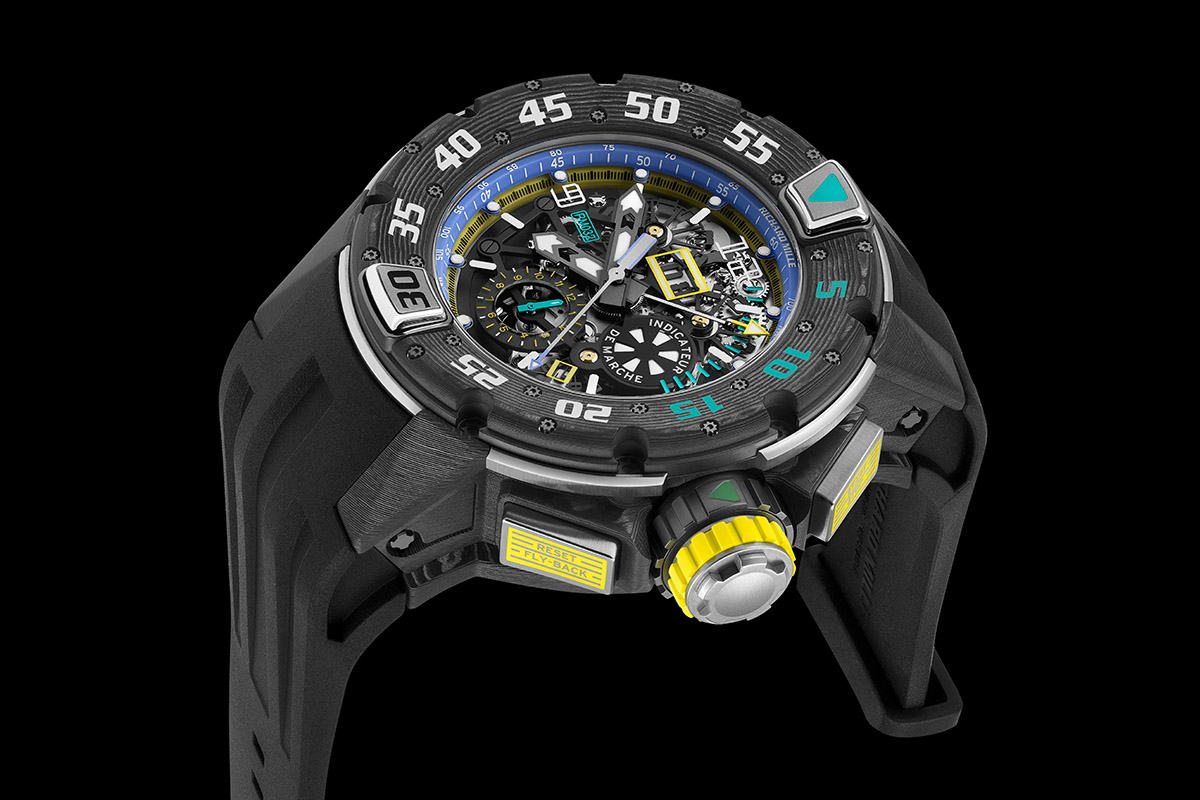 Ebbene, per questo RM 032 Richard Mille ha sviluppato e brevettato un sistema che può bloccare i pulsanti e garantire impermeabilità fino a 30 bar. Si aziona ruotando un apposito anello posto all’interno della corona: se sull’anello compare un indice verde, il sistema è sbloccato, se l’indice è rosso è azionato. In questo modo eventuali sovrapressioni o urti sulla corona non danneggiano il movimento e si migliora la resistenza all’acqua grazie a una maggiore pressione sulle guarnizioni.
