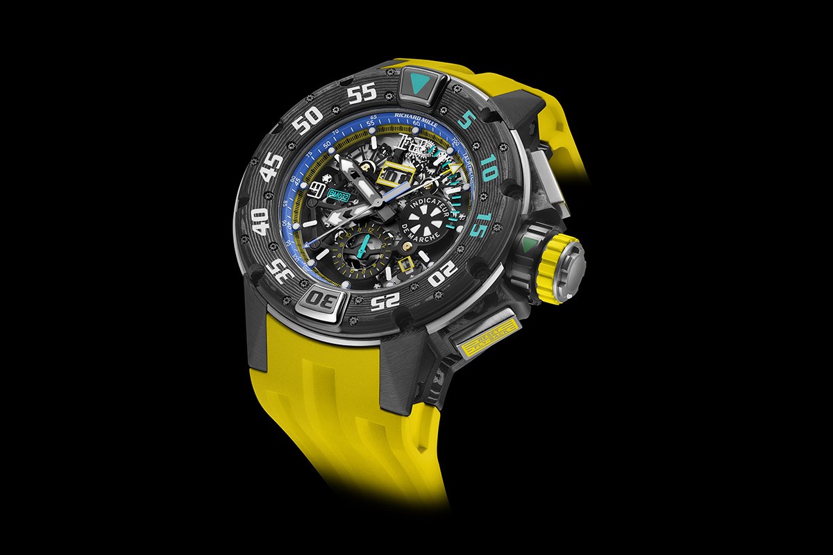 La collezione RM 032 nasce nel 2011 con la prima referenza e, trattandosi del primo subacqueo di Richard Mille, la scelta della forma, per quanto spiazzante, risultò coerente con la funzione per la quale l’orologio era stato progettato. Del resto è meno complesso impermeabilizzare una cassa tonda rispetto a una di forma, perché priva di angoli o spigoli che sono punti di debolezza in balia della pressione dell’acqua. Detto questo, la Manifattura non poteva limitarsi a riprendere pedissequamente i codici dei diver tradizionali ma doveva piegarli alla propria visione.