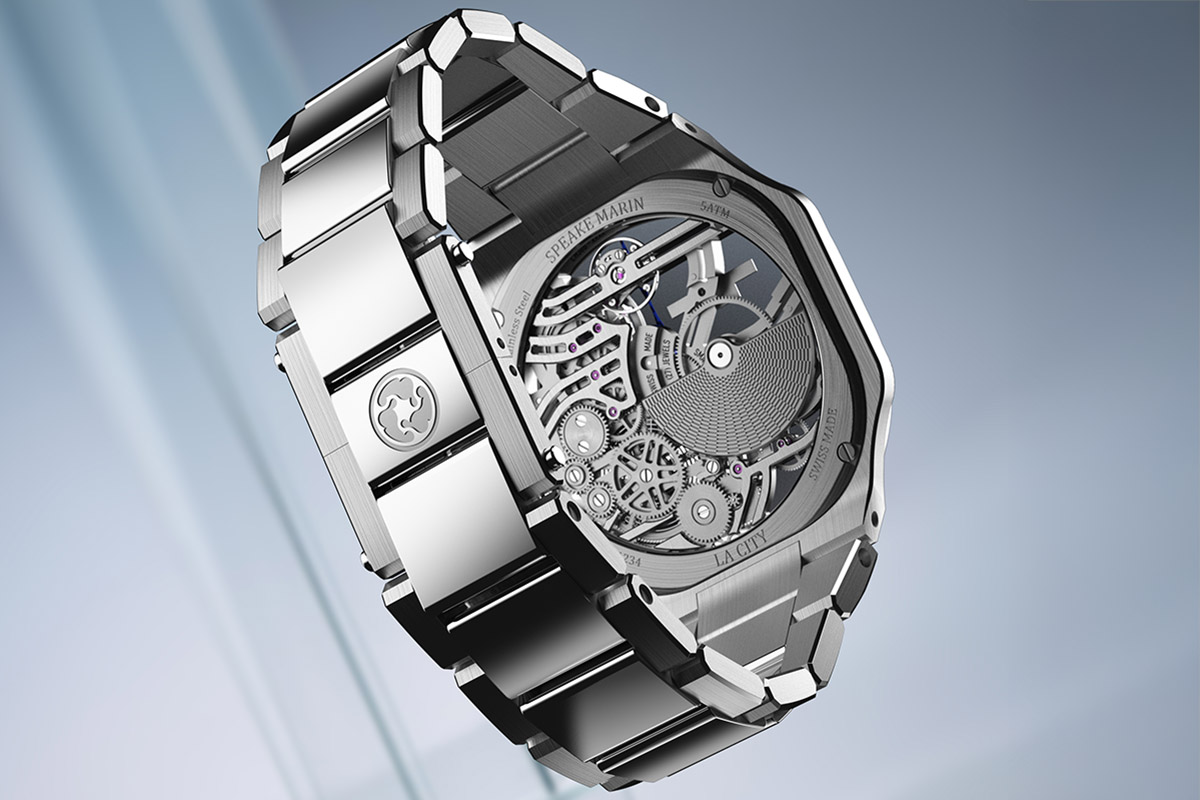 Con una produzione di circa 600 pezzi l’anno e una collezione che comprende sei linee, la giovane ma promettente Casa si è già cimentata nell’ambito degli scheletrati. Un genere di grande richiamo, diventato negli ultimi decenni un banco di prova per tutti i segmenti del mercato, perché permette di esprimere un’idea, unica e personale, di gusto e di competenze tecniche attuali. Dopo aver esordito con l’Opeworked (Tourbillon e Dual Time), Speake Marin di recente ha proposto il Ripples Skeleton, ultimo nato della serie Ripples che dal 2022 rappresenta per la Marca la cosiddetta linea “sport-chic”. Orologi con cassa e bracciale (spesso integrato) in acciaio, di cui ogni casa, vista la domanda, sembra non poter fare a meno.