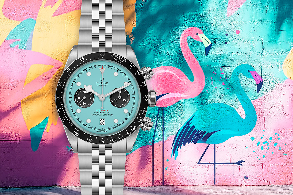 Prima il rosa, ora l’azzurro. Anzi, il turchese: un colore saturo, che secondo Tudor rimanda alle atmosfere “soleggiate ed effervescenti” di South Beah, Florida. E ci sta, la zona sud di Miami comprende zone chiamate proprio Flamingo Park, Flamingo West, ed è intrisa quel kitch anni Cinquanta dalle sfumature vibranti e divertenti. Ma non lasciamoci ingannare dalle storielle del marketing. Il nuovo cronografo Black Bay “Flamingo Blue” risponde piuttosto alla tendenza dell’orologeria contemporanea in cui vincono i quadranti impregnati dalle cromie accese. Il che vuol dire flash di verdi, di fucsia, di gialli, quei toni acidi e artificiali che la moda definisce lollipop perché ricordano i lecca-lecca dell’infanzia.