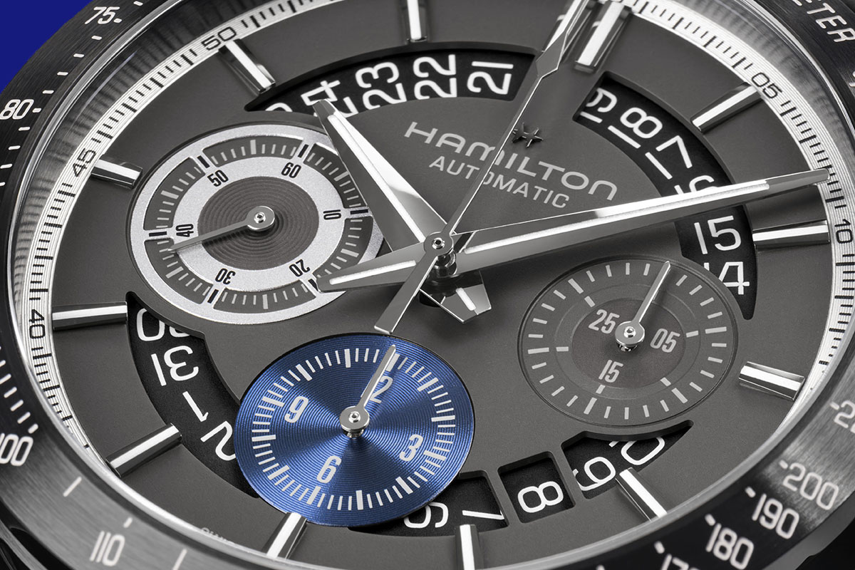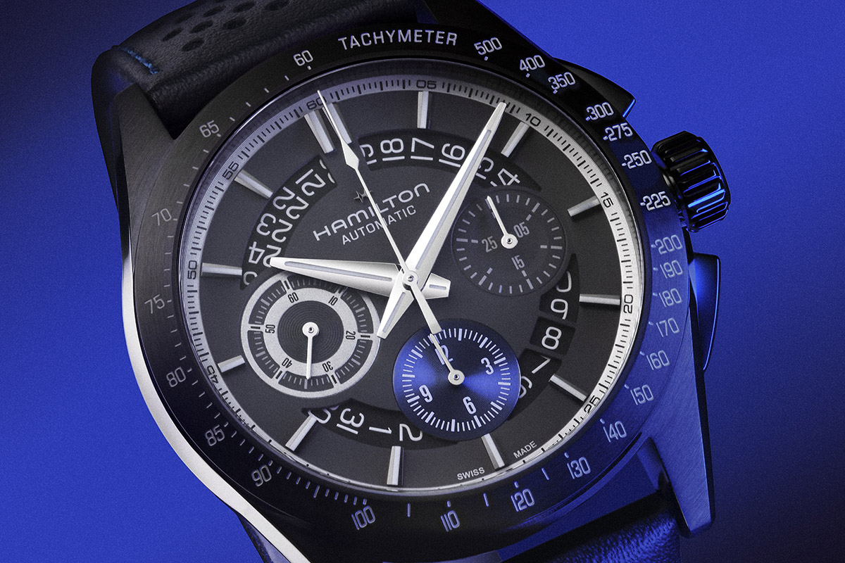 Ricordo bene quando Hamilton presentò il Jazzmaster. Era il 2005, eravamo tutti a Baselworld: e la Casa americana (ormai naturalizzata svizzera) tracciava un parallelo fra la propria storia e quella della musica jazz – entrambe nate Oltreatlantico alla fine dell’Ottocento. Festeggiava così le “proprie radici ritmiche” con una collezione che adottava “i ritmi spasmodici delle città del Ventunesimo secolo” (nel virgolettato riporto testualmente il comunicato dell’epoca: sono andata a scartabellare nel mio archivio di cartelle stampa per recuperarlo). Quel lancio di vent’anni fa mi è venuto in mente non appena ho visto il nuovo Jazzmaster Performer Auto Chrono, in cui mi è sembrato di ritrovare la stessa attitudine al dinamismo e lo stesso spirito metropolitano delle origini.