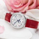 Ricorrente è anche la special edition prodotta per l’occasione dalla Manifattura di Le Brassus. In questo caso la personalizzazione sta nel colore rosso diffuso, nella trotteuse a forma di freccia che trafigge un cuore e negli altri cuoricini che circondano le vezzose fasi di Luna. La cassa (34,9 mm) in oro bianco e il quadrante in madreperla sono ornati di diamanti taglio brillante (2.22 ct. in totale). Mentre il movimento automatico, calibro 1153L di manifattura (con 100 ore di autonomia), ha la massa oscillante scheletrata e decorata da un cuore. Edizione limitata di 14 esemplari, 40.300 euro.