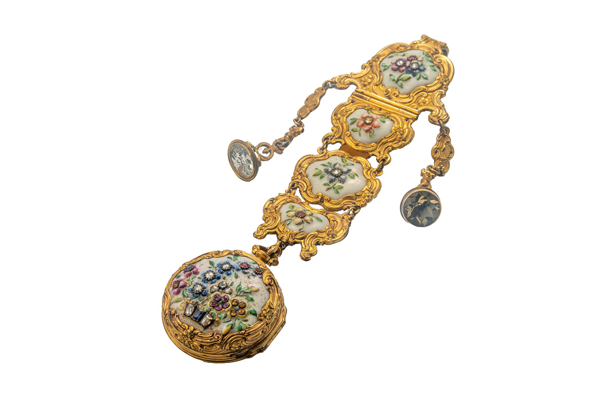 Nasce la châtelaine, cioè la ricca catena a placchette da agganciare alla cintura, all’altezza della vita, cui attaccare le piccoli oggetti necessari: ditali, agorai, forbicette per le signore; sigilli per la ceralacca, ornamenti e talismani per i signori. Per entrambi – quasi sempre – l’orologio è in posizione centrale.