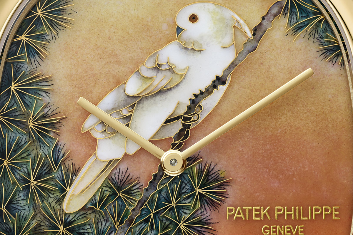 Quasi un metro di filo d’oro lavorato a mano per disegnare un pappagallo posato sul ramo di un pino. E 20 colori di smalti traslucidi, opachi e opalescenti per dare le tinte della vita vera al disegno che esalta una delle innumerevoli bellezze della natura. Tutto questo sul quadrante di dieci orologi Patek Philippe, lavorato in smalto cloisonné e impreziosito dalla pittura miniata su smalto. L’edizione limitata del Golden Ellipse Ref. 5738/50J-011 “Cacatoès à huppe jaune” (Cacatua crestagialla) è tra le punte di diamante della mostra Alto Artigianato 2025, inaugurata sabato 5 e aperta fino a sabato 26 aprile nei Salons Patek Philippe a Ginevra.