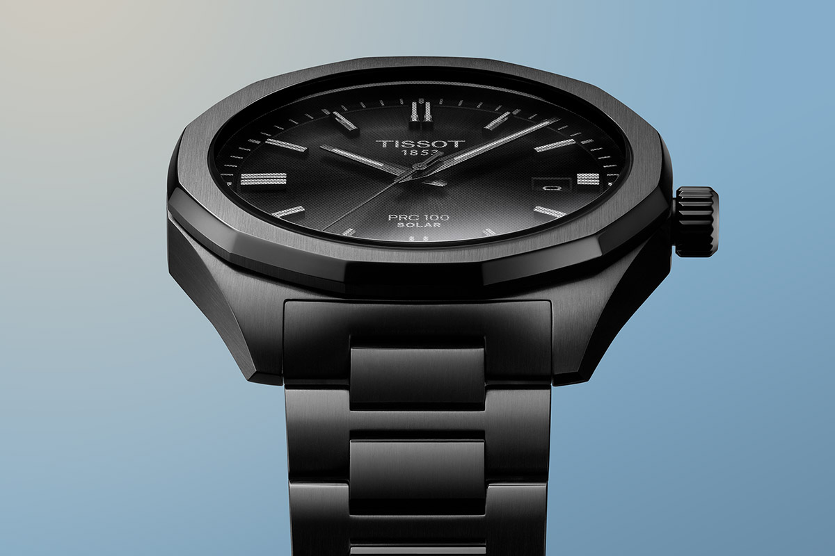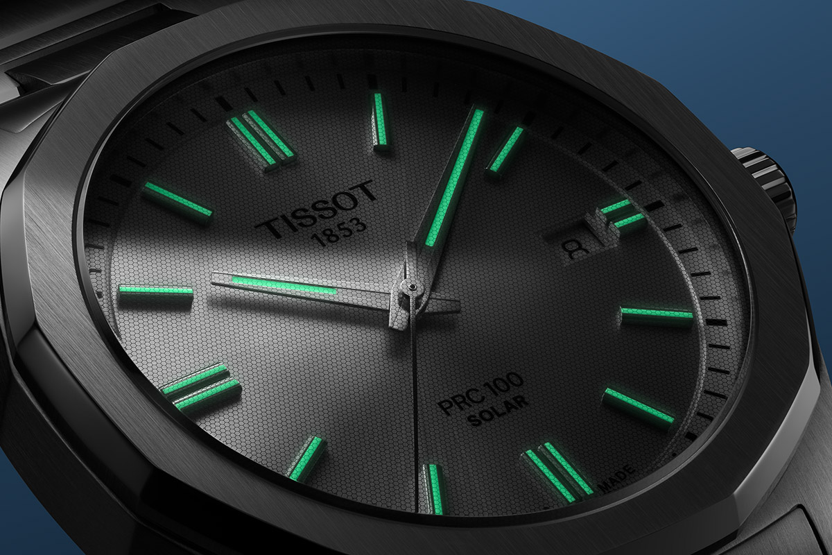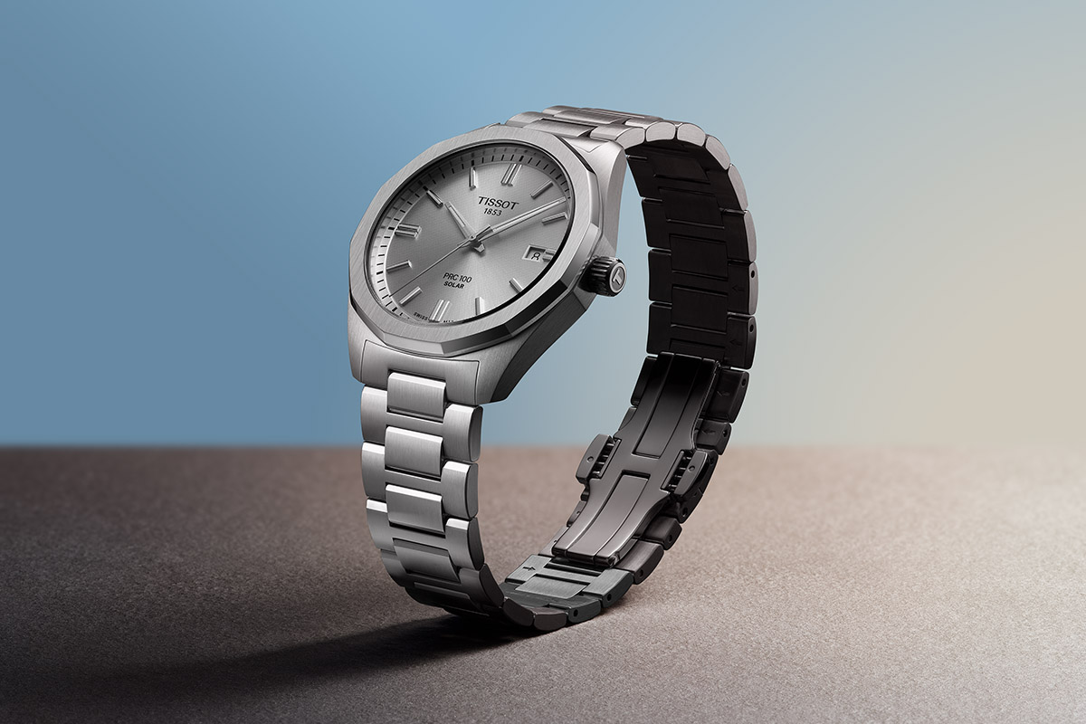 È un orologio analogico, dal design pulito, con la cassa in acciaio da 39 millimetri di diametro e di forma dodecagonale, enfatizzata dalla lunetta a 12 lati. Le dimensioni contenute lo rendono adatto tanto ai polsi maschili quanto a quelli femminili, che in tarda primavera potranno giovare anche della versione da 34 mm. La presenza di un movimento al quarzo, nella fattispecie un Eta F06.615, permette inoltre di contenerne lo spessore, limitandolo ad appena 9,2 mm. Nel complesso, il nuovo Tissot PRC 100 Solar è pensato per l’uso quotidiano e disinvolto. Lo dimostrano l’impermeabilità della cassa pari a 10 bar e il rivestimento in Super-Luminova, applicato agli indici a bastone e alle lancette delle ore e dei minuti.
