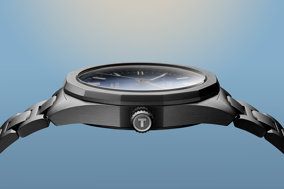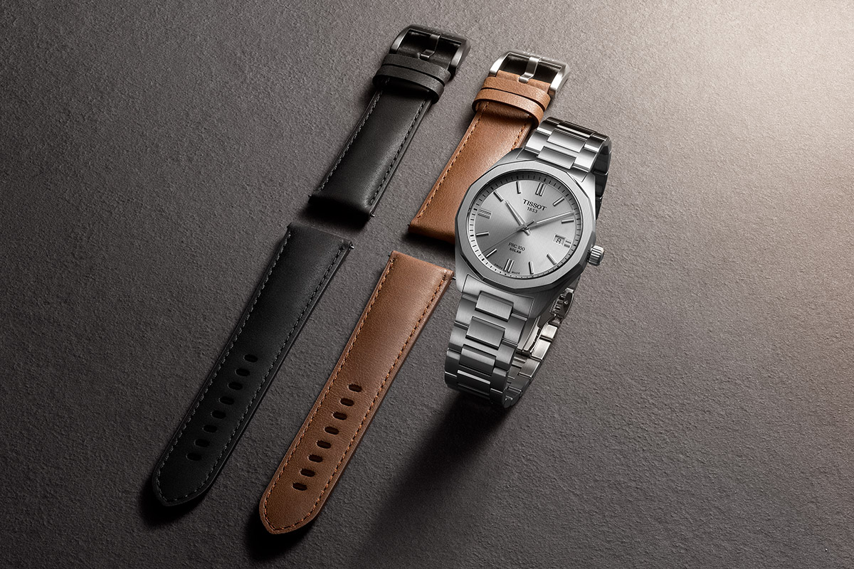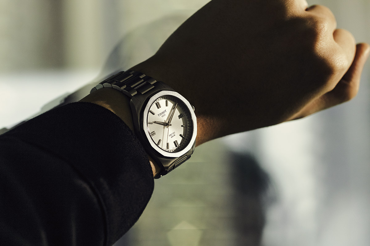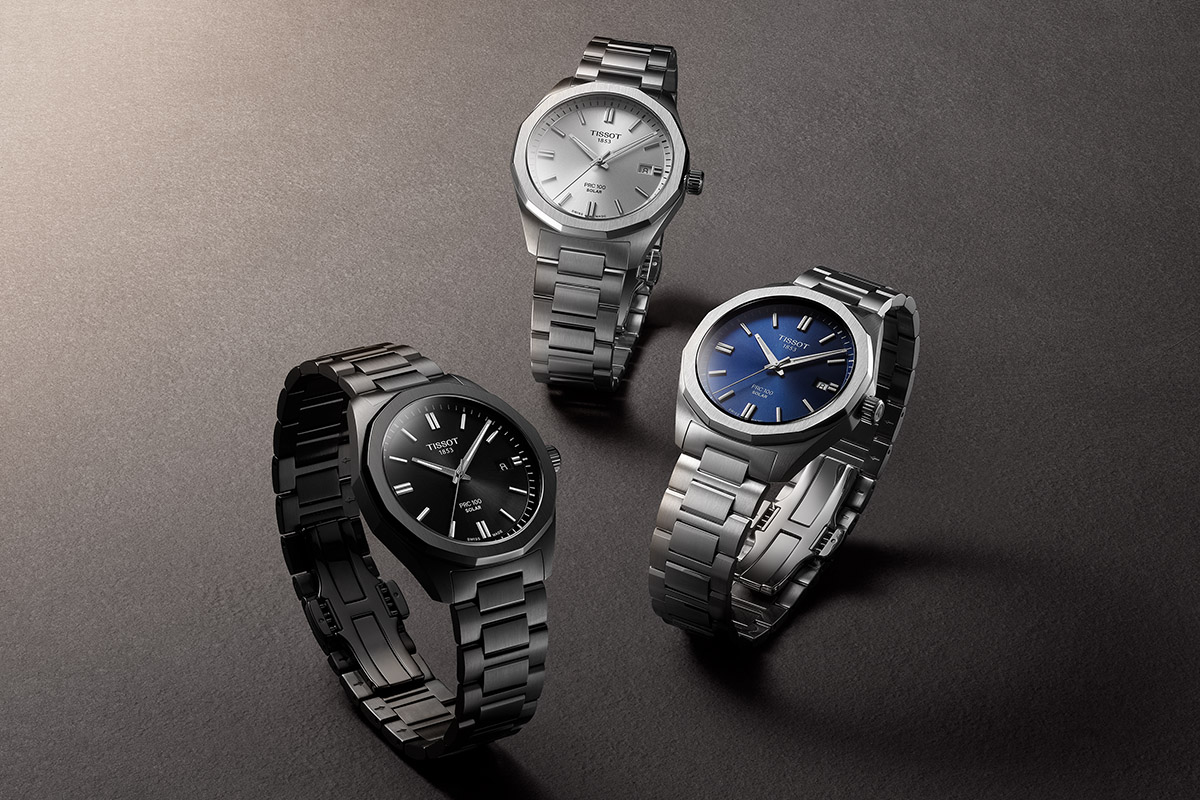 È un orologio analogico, dal design pulito, con la cassa in acciaio da 39 millimetri di diametro e di forma dodecagonale, enfatizzata dalla lunetta a 12 lati. Le dimensioni contenute lo rendono adatto tanto ai polsi maschili quanto a quelli femminili, che in tarda primavera potranno giovare anche della versione da 34 mm. La presenza di un movimento al quarzo, nella fattispecie un Eta F06.615, permette inoltre di contenerne lo spessore, limitandolo ad appena 9,2 mm. Nel complesso, il nuovo Tissot PRC 100 Solar è pensato per l’uso quotidiano e disinvolto. Lo dimostrano l’impermeabilità della cassa pari a 10 bar e il rivestimento in Super-Luminova, applicato agli indici a bastone e alle lancette delle ore e dei minuti.