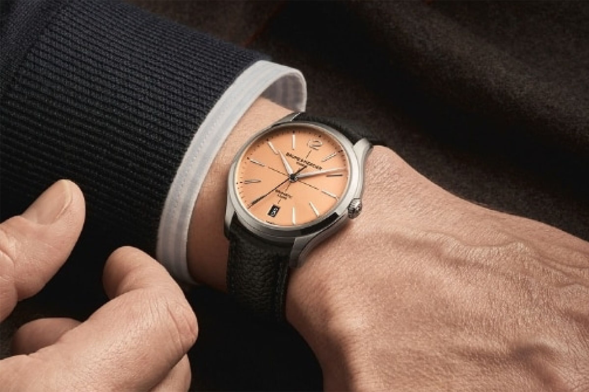 Cassa (39 mm) in acciaio, impermeabile fino a 5 atm. Movimento meccanico a carica automatica, calibro Baumatic BM13-1975A realizzato in esclusiva, con autonomia di 5 giorni e datario. Quadrante opalino, indici applicati, vetro zaffiro, fondello con oblò in vetro zaffiro, cinturino in pelle di vitello, intercambiabile; il packaging include un secondo cinturino beige, sempre in pelle di vitello. 3.500 euro.