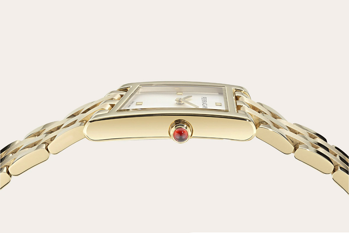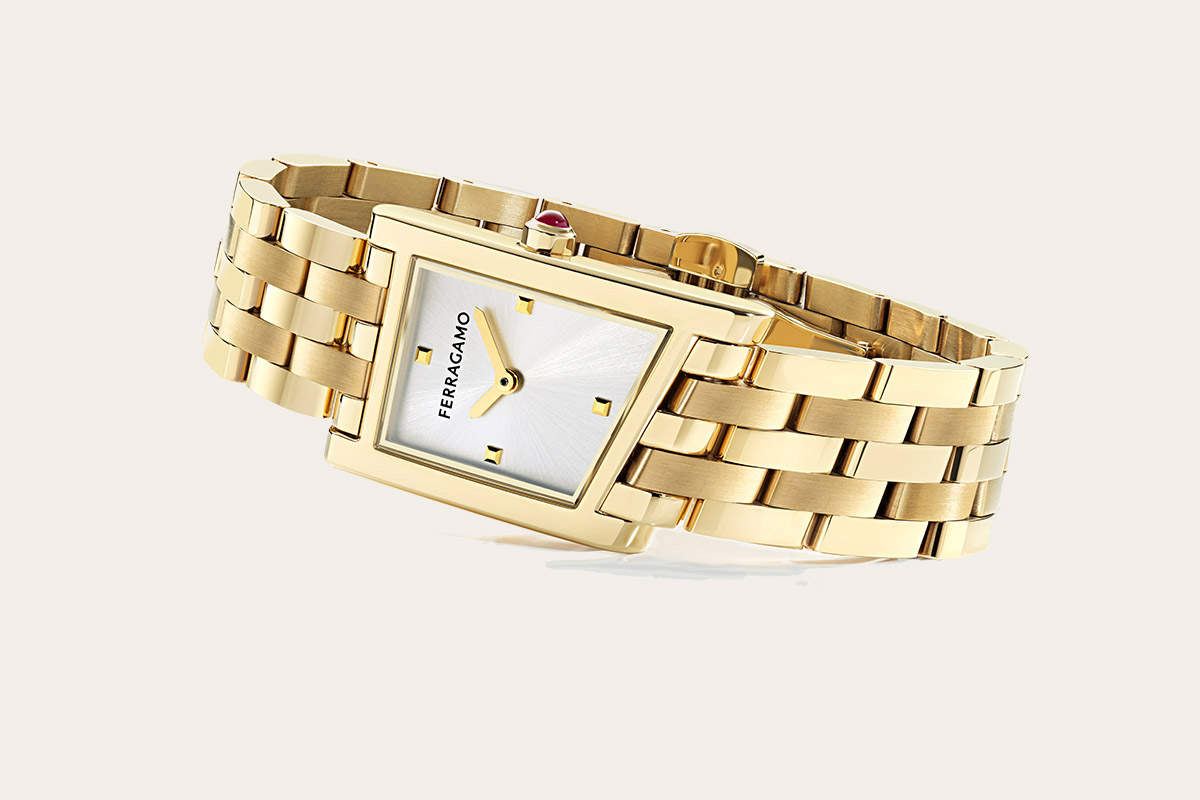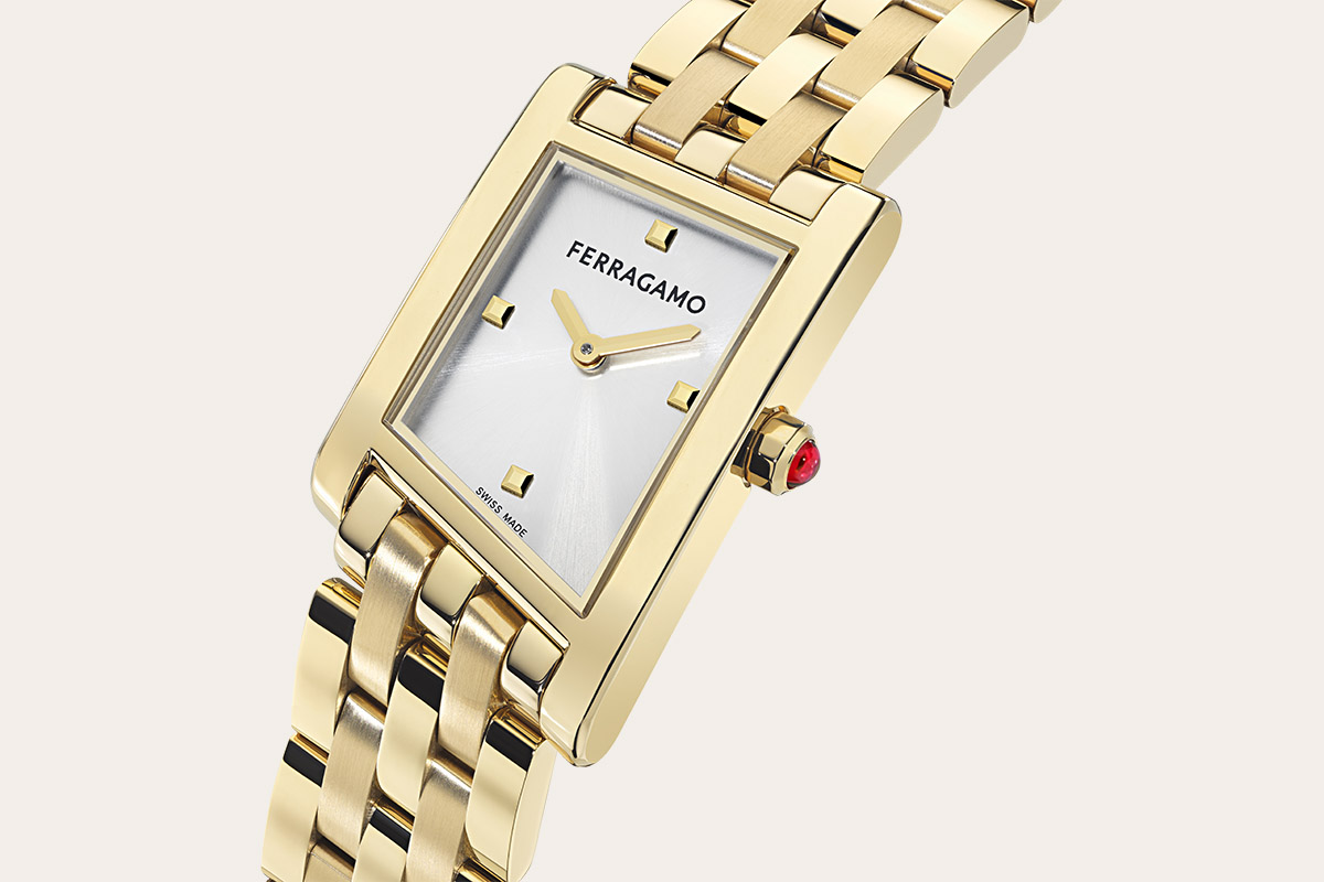 Essenziale il quadrante, con il lettering del logo a ore 12 come unico decoro che si staglia in nero sullo sfondo argenté. Rifinito da una spazzolatura soleil, è scandito ai quarti da quattro indici a borchia, anch’essi dorati, in pendant con le piccole lancette a spada. Sulla carrure a ore 3 spicca la corona ornata da un cristallo cabochon rosso, che richiama il colore Ferragamo. Il fondello in acciaio pieno racchiude un movimento al quarzo Swiss made, preciso e affidabile (Ronda 762.2). Due le versioni principali: con i brancard satinati oppure incastonati di diamanti allineati.