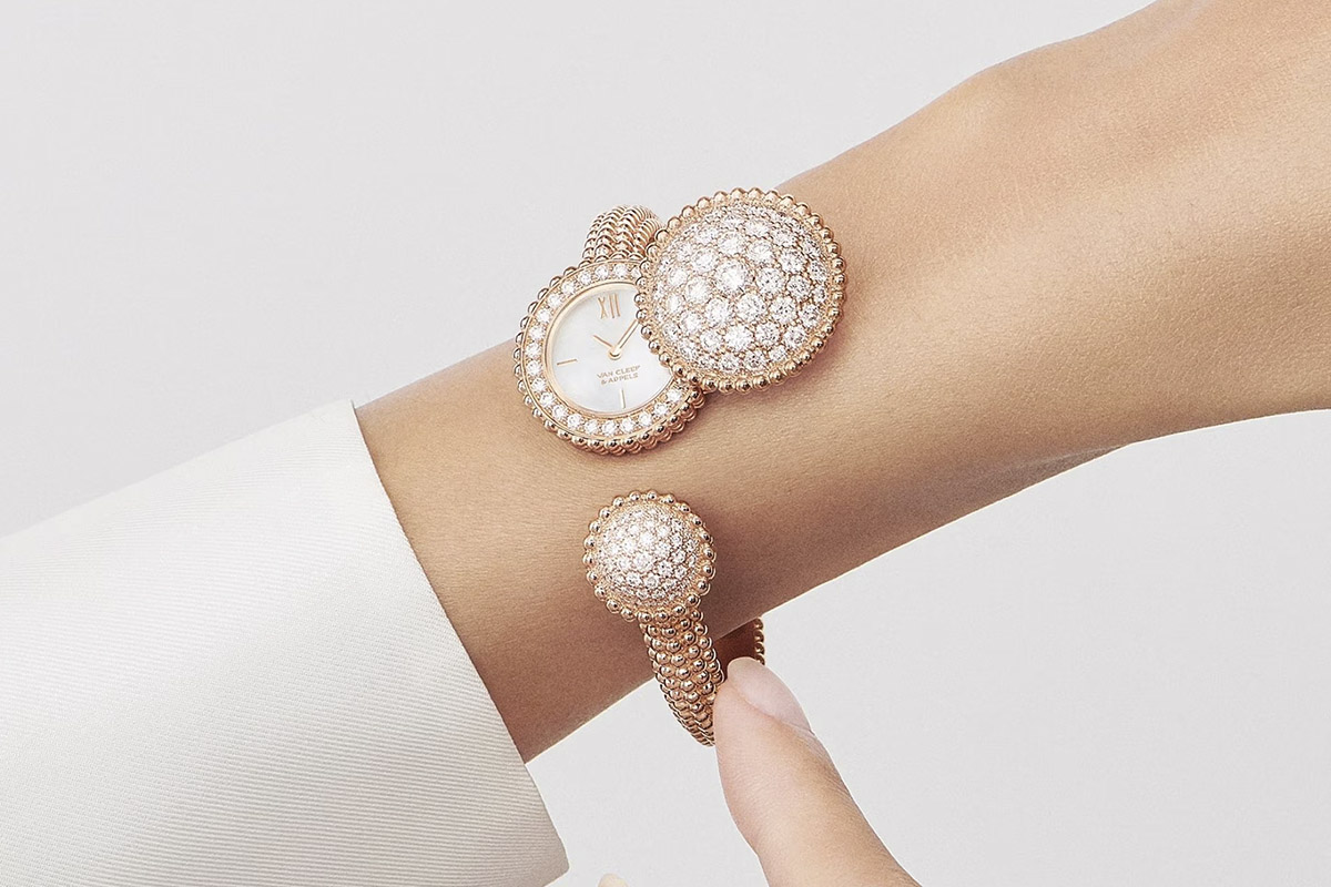 Ma l’elenco dei bangle watch contemporanei sarebbe incompleto senza la citazione del Perlée Toi & Moi di Van Cleef & Arpels. Presentato alla fine del 2023, prende spunto dalle piccole boule che fanno parte dell’heritage della Casa, proprio come il genere degli orologi “a segreto” cui appartiene. Qui il sottile bracciale rigido in oro rosa o giallo è composto interamente dal motivo perlé, allineato su cinque file, e termina con due grandi semisfere di diverse dimensioni. Quella più grande nasconde l’orologio: ma basta ruotare il cabochon di 90° per rivelare il quadrante in madreperla, circondato dalla lunetta con diamanti.