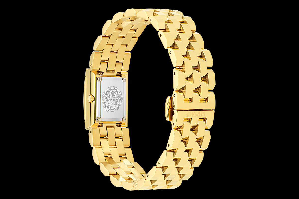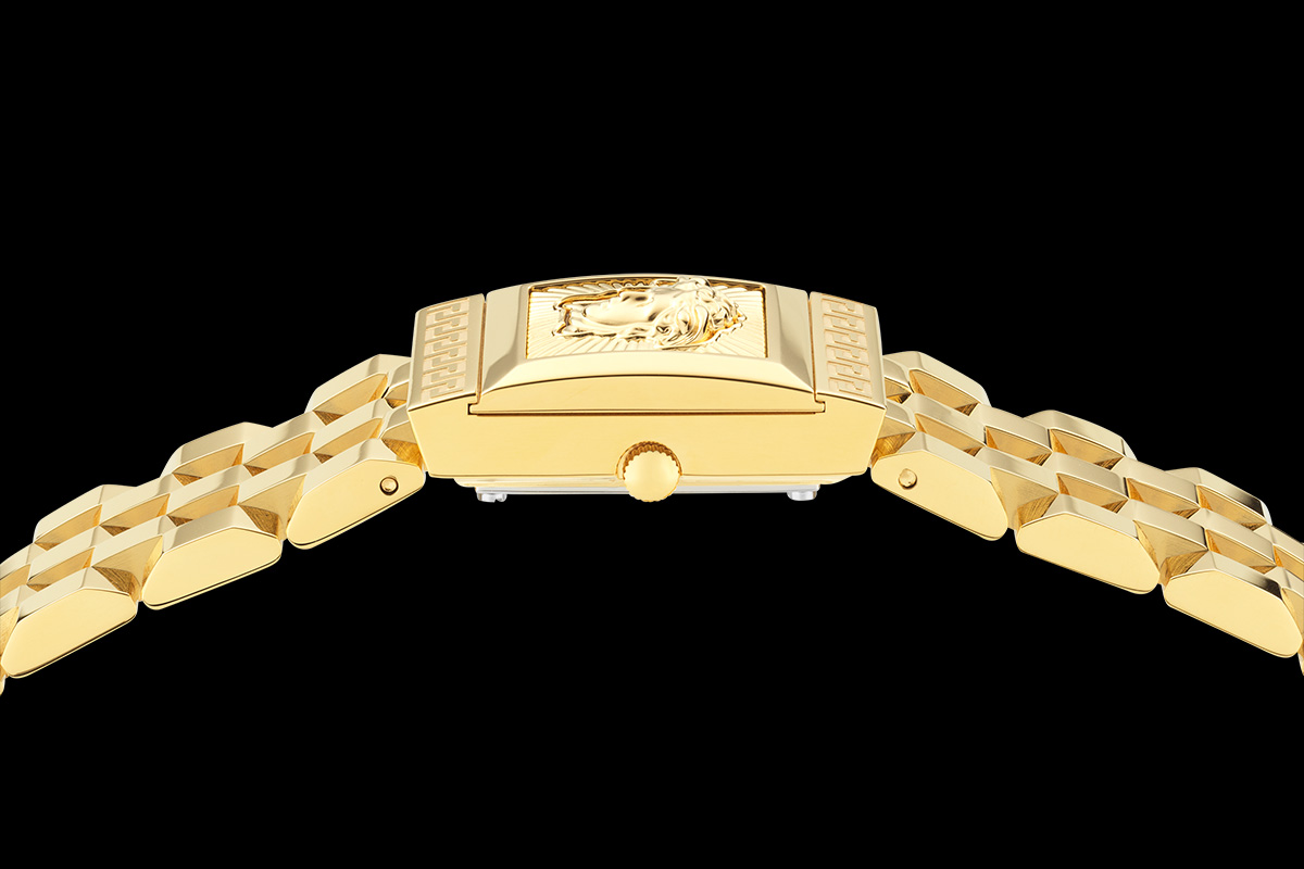 Frutto di una cura minuziosa di ogni singolo dettaglio, i nuovi Versace Reveal sono capaci di lasciare un’impressione indelebile su chi li indossa. La cassa di dimensioni contenute è in acciaio Ip oro giallo, come il bracciale cui è perfettamente integrata, nascosta, quasi inglobata. Sulla cover scorrevole – slider, la definisce la Maison – la leggendaria Medusa si fonde con il motivo della Greca. L’una si protende verso lo spazio esterno dal centro del quadrato a raggi di sole che nasconde il quadrante. L’altra (la Greca) fa da cornice, creando un continuum con il bracciale che, nell’alternanza di cinque file, pure sembra protendersi verso la tridimensionalità.