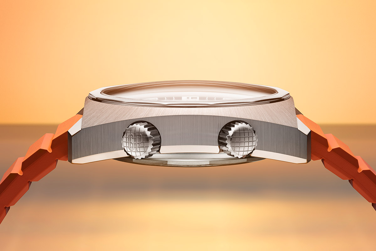 Given the current fashion for pairing sneakers with formal wear, you won’t look out of place wearing the Deep Diver in relaxed yet stylish work environments. Plus, the two interchangeable rubber straps – blue and orange – let you switch things up. With its modest case size of 40.3 x 38 mm and vibrant colour, the watch could even look great on a woman’s wrist.