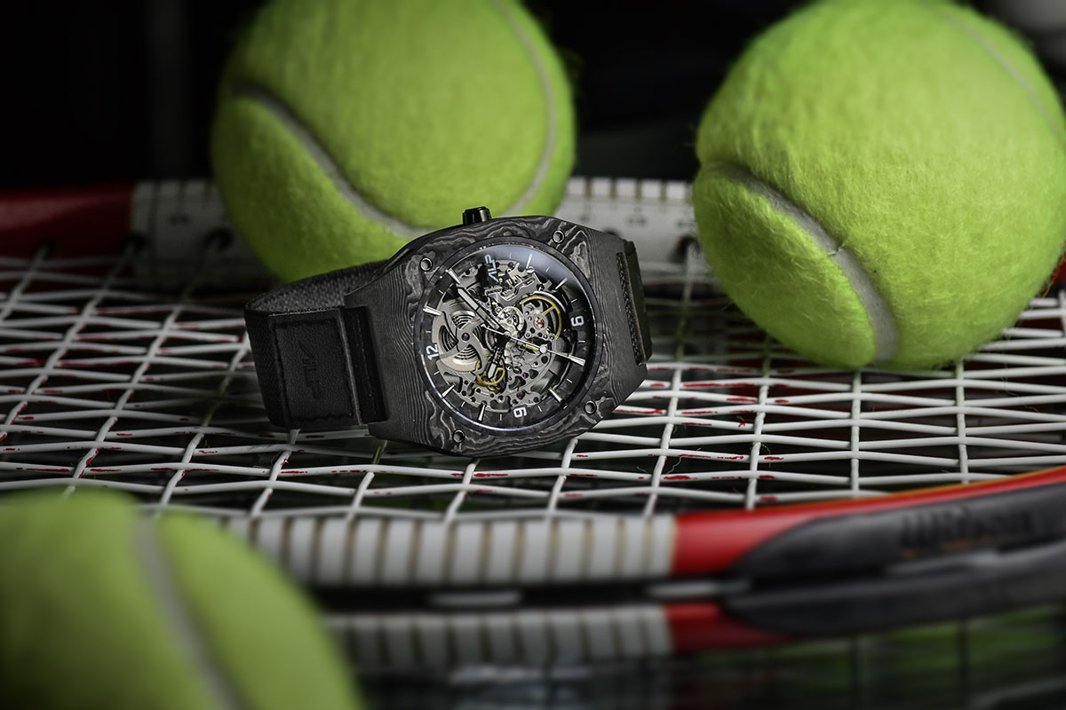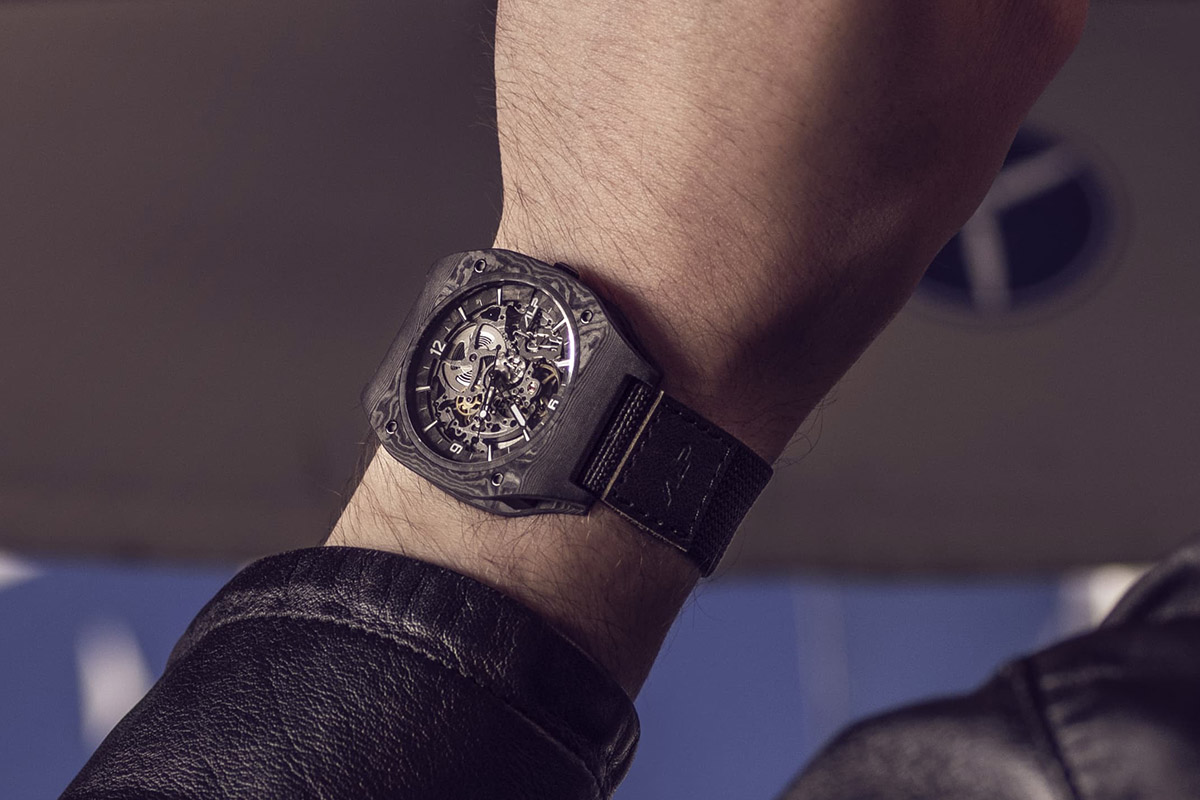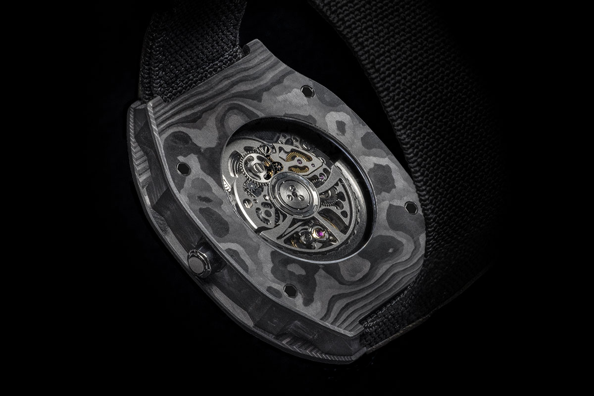 Proprio sul carbonio si basa la cassa dell’orologio. Una cassa che ha avuto bisogno di ben quattro anni di ricerca e sviluppo durante i quali, ci ha detto Perusi, sono stati innumerevoli i pezzi che hanno dovuto essere eliminati. Principalmente perché non rispondevano ai requisiti stretti di qualità e robustezza che i due fondatori stavano cercando. Ecco perché, alla fine, si è arrivati al Carbon TSC, una tipologia di carbonio forgiato ad alte prestazioni, di derivazione aerospaziale. Un sistema di sottilissimi fogli di materiale spessi 90 micron, compressi ad altissima pressione e a temperatura controllata. Un materiale dieci volte più resistente e cinque volte più leggero dell’acciaio. E tre volte più leggero del titanio. Più leggero di una piuma, appunto.
