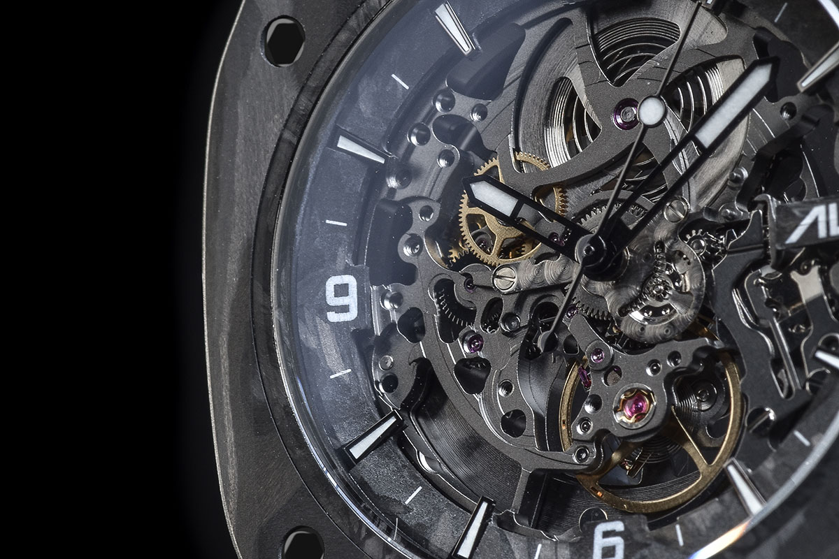 Ecco perché il calibro automatico AM-1s è realizzato da Soprod, quindi Swiss Made. L’architettura è quella dell’ETA 2892 o del Sellita SW300, però scheletrato e ridotto al minimo peso. Per combaciare con la promessa di leggerezza e robustezza che ALP ha messo nero su bianco nel momento in cui ha deciso di proporsi nel segmento premium dell’orologeria.