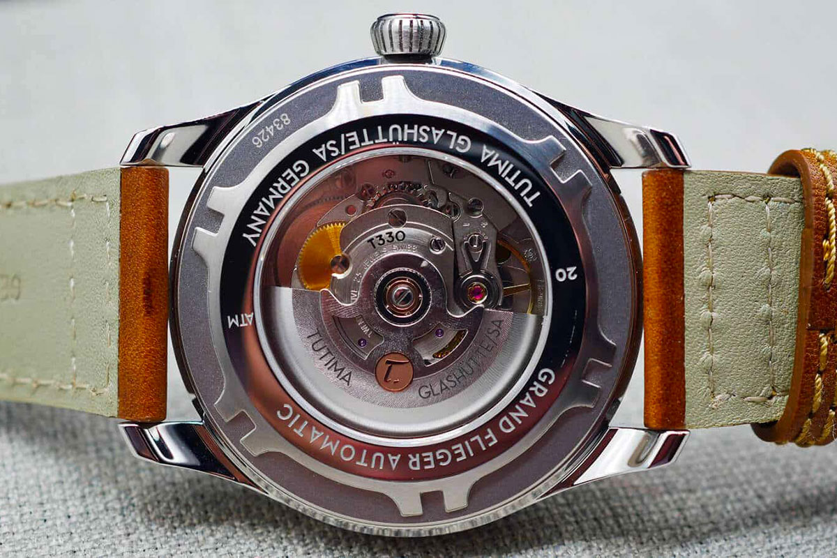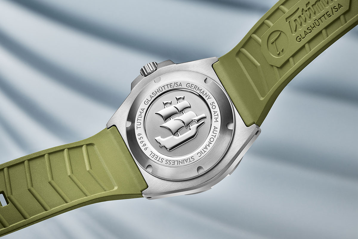 Riguardo alla meccanica, la manifattura si è affidata al calibro Tutima 330, un movimento automatico che incassa in diversi solo tempo in produzione. Sviluppato su base ETA 2836-2, offre prestazioni consuete: 28.800 alternanze/ora e 38 ore di autonomia, come da copione. La massa oscillante è rodiata e impreziosita dal sigillo Tutima in oro rosa. A differenza di altre referenze nelle quali è visibile attraverso il fondello trasparente, qui è occultata da un fondello chiuso e avvitato, decorato con un veliero a rilievo.