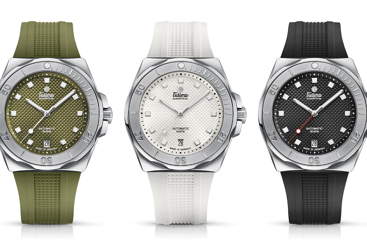 Per il Tutima M2 Seven Seas S, i progettisti hanno scelto tre varianti: verde oliva, bianco e nero. Su quest’ultimo, la lancetta dei secondi spicca per il colore, rosso vivo, mentre nelle altre due versioni è argento, in tinta con quelle di ore e minuti.