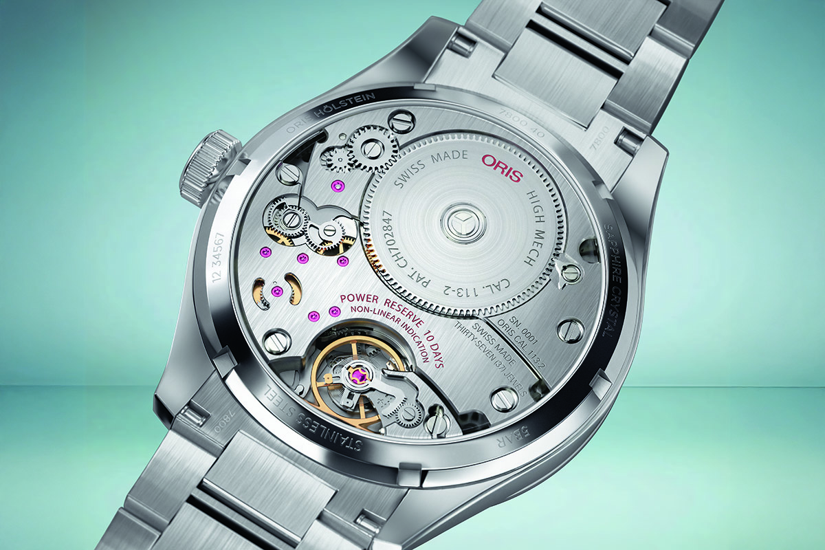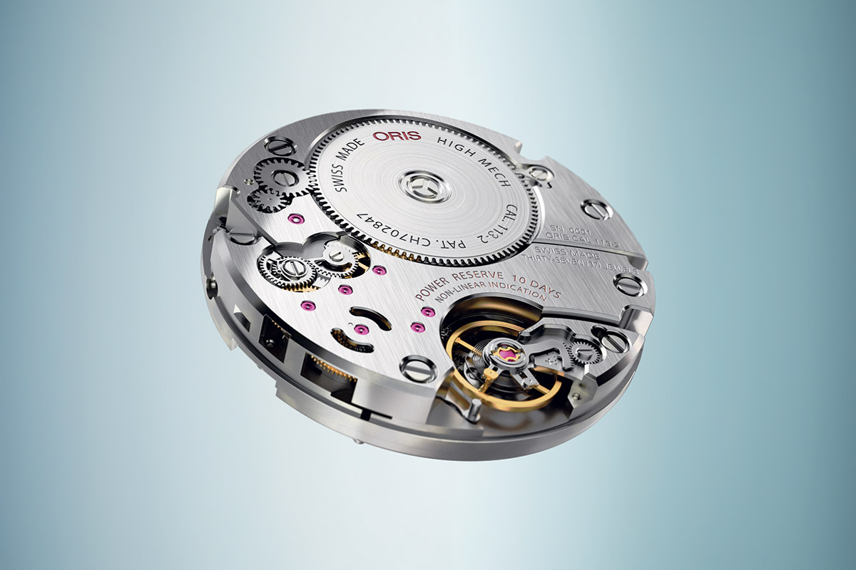 Non sono molti gli orologi sul mercato a vantare un’autonomia così lunga, e nemmeno prossima. Per ottenere un simile risultato, Oris non si è affidata a un doppio bariletto, ciascuno ospitante una molla motrice, ma ne ha mantenuto soltanto uno. Di misura extralarge, sia chiaro – se ne osserva il coperchio attraverso il fondello in vetro zaffiro – e dotato di una molla di carica particolarmente lunga.