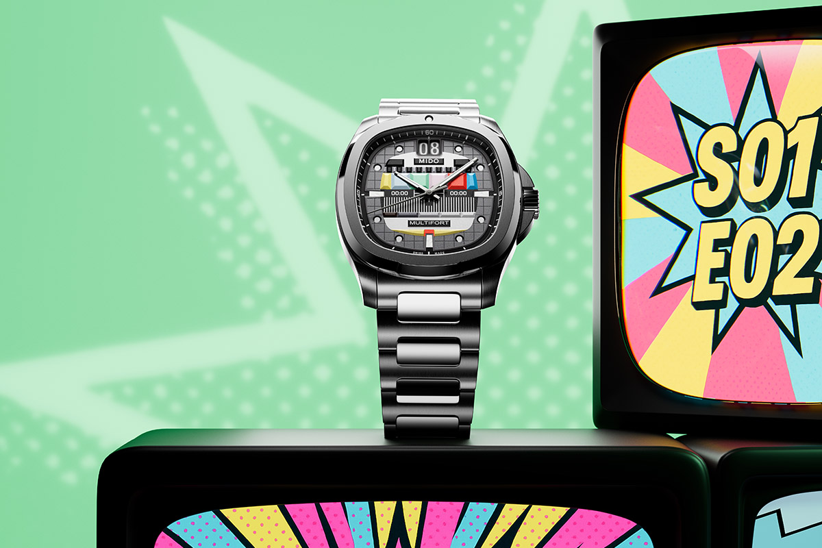 Seconda special edition che prende ispirazione dai televisori d’antan. La cassa, “a schermo tv” degli anni ’70, misura 40 mm di lato ed è realizzata in acciaio Pvd grigio satinato, mentre il quadrante richiama le barre dei test di trasmissione dell’epoca. Monta il calibro automatico Mido 80 con autonomia di 80 ore e spirale in NivachronTM antimagnetica. Si allaccia al polso con un bracciale integrato, ma il packaging include anche due cinturini intercambiabili in caucciù, blu o giallo. 1.490 euro.