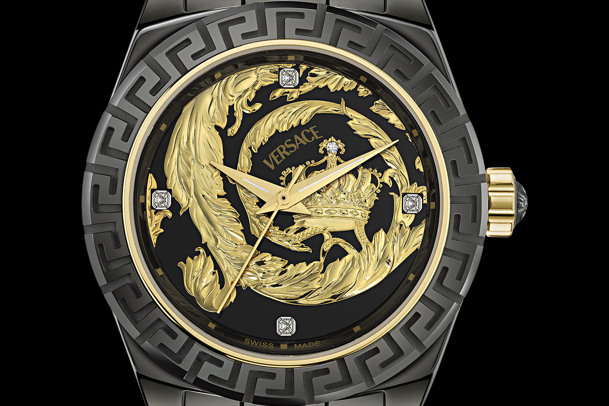Questa volta, però, la virata è dritta nella direzione del lusso. Ce ne accorgiamo subito osservando il quadrante, sfarzoso. Parlando del motivo Barocco abbiamo prima appositamente tralasciato i particolari. La spirale dorata altro non è che la caratteristica foglia d’acanto che si “scioglie” in una corona regale – elementi tipici del pattern inventato da Gianni Versace. Ma non è finita. La corona presenta un diamante incastonato sulla sommità e altri quattro diamanti poi sostituiscono gli indici. In pratica una piccola costellazione di stelle brilla in una notte nera.