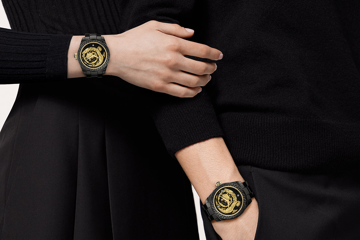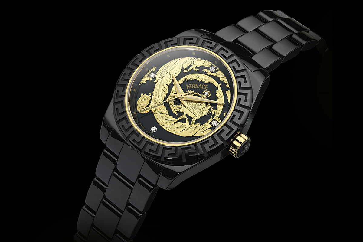 Però, anche sulla palette cromatica notiamo una scelta conservativa, che non poteva che andare a pescare tra le due versioni in cui il primo DV One fu presentato a Baselworld nel 2005: bianco o nero? Nero. Una cromia decisa, duttile quanto mai, che esalta la sfarzosa spirale dorata con cui è decorato il quadrante. Vi ricorda qualcosa? Certo, il motivo Barocco – protagonista stilistico, nel tempo, di diverse collezioni di accessori – è estratto dagli archivi Versace. D’altronde un forte richiamo all’heritage aziendale sembrava dovuto in una collezione che celebra il decennale del primo orologio disegnato da Donatella Versace.